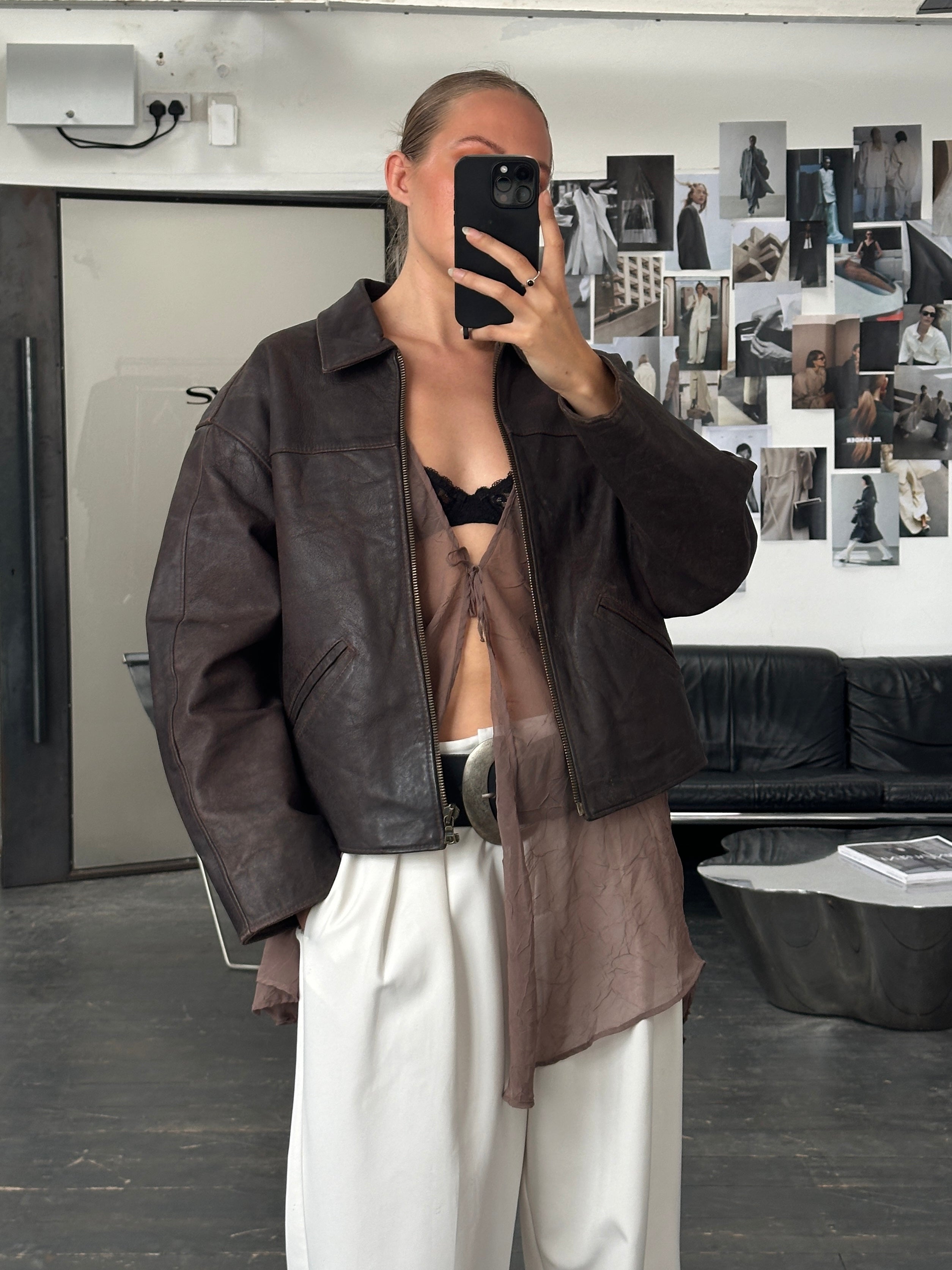 A sheer Italian robe-dress, crafted in crushed-texture polyester with a fluid, diaphanous drape. Cut with wide kimono sleeves and a plunging neckline, Finished in a muted taupe tone, it moves between resort layering and evening statement with ease.