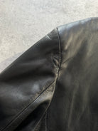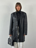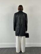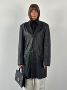 Black smooth leather trench coat with a clean single breasted cut and minimal lines. Crafted in Italy by Douglas and finished with a soft drape typical of 1990s outerwear.