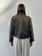 Vintage 1980s women’s leather biker jacket in a natural taupe tone black tone. A structured cropped silhouette with a classic biker shape and a lightly padded interior.