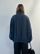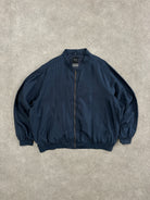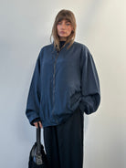 A navy pure silk bomber jacket from Smooth in a relaxed 1980s silhouette. The deep navy tone and minimalist cut align with a clean contemporary aesthetic while keeping the soft drape and sheen expected from vintage silk.
