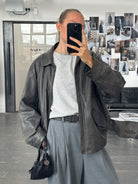1980s - 1990s vintage leather bomber jacket with aging in a boxy fit with adjustable side tabs.