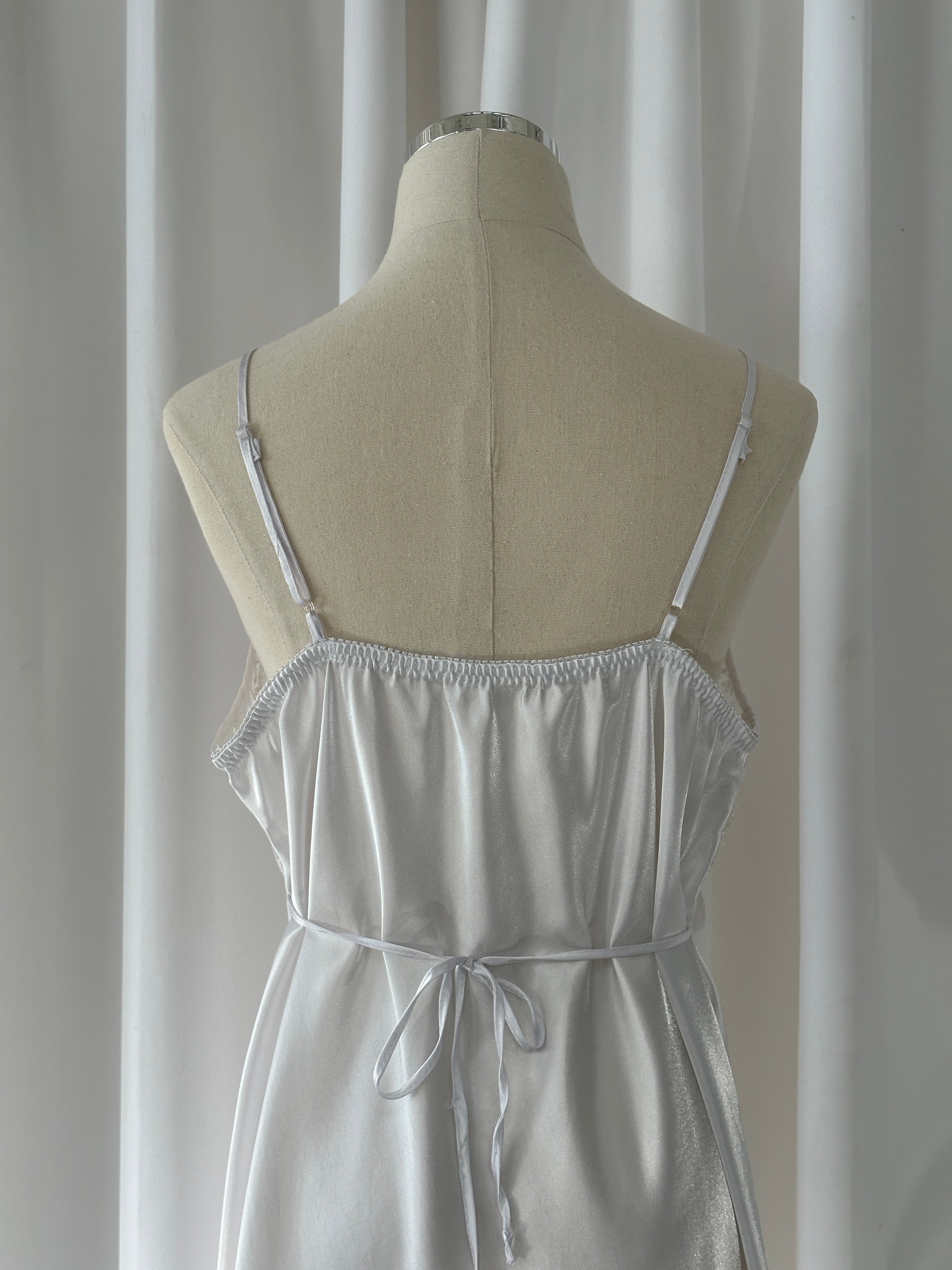 A vintage satin slip with floral embroidered mesh bust and fluid drape, blending elegance and allure.