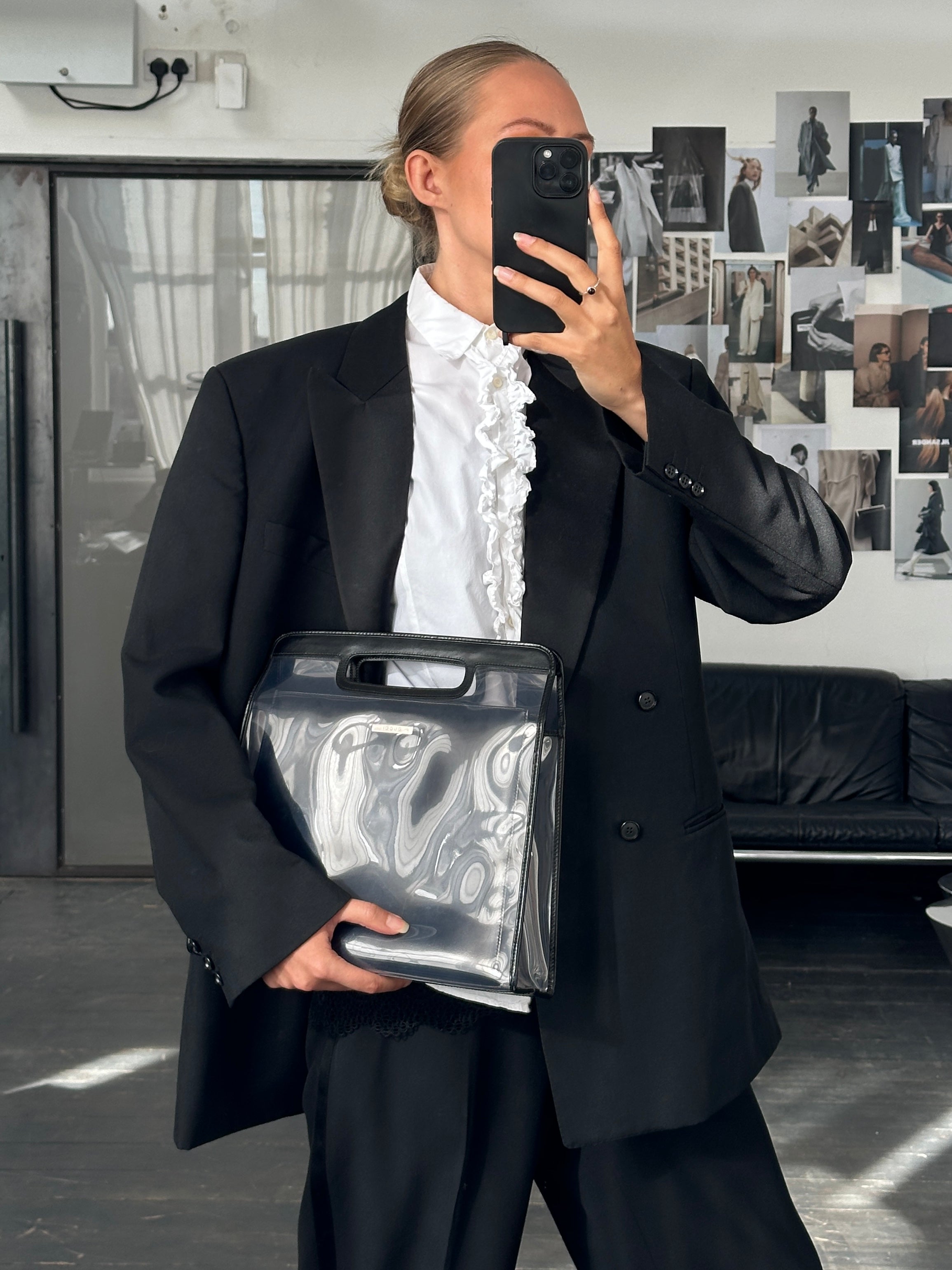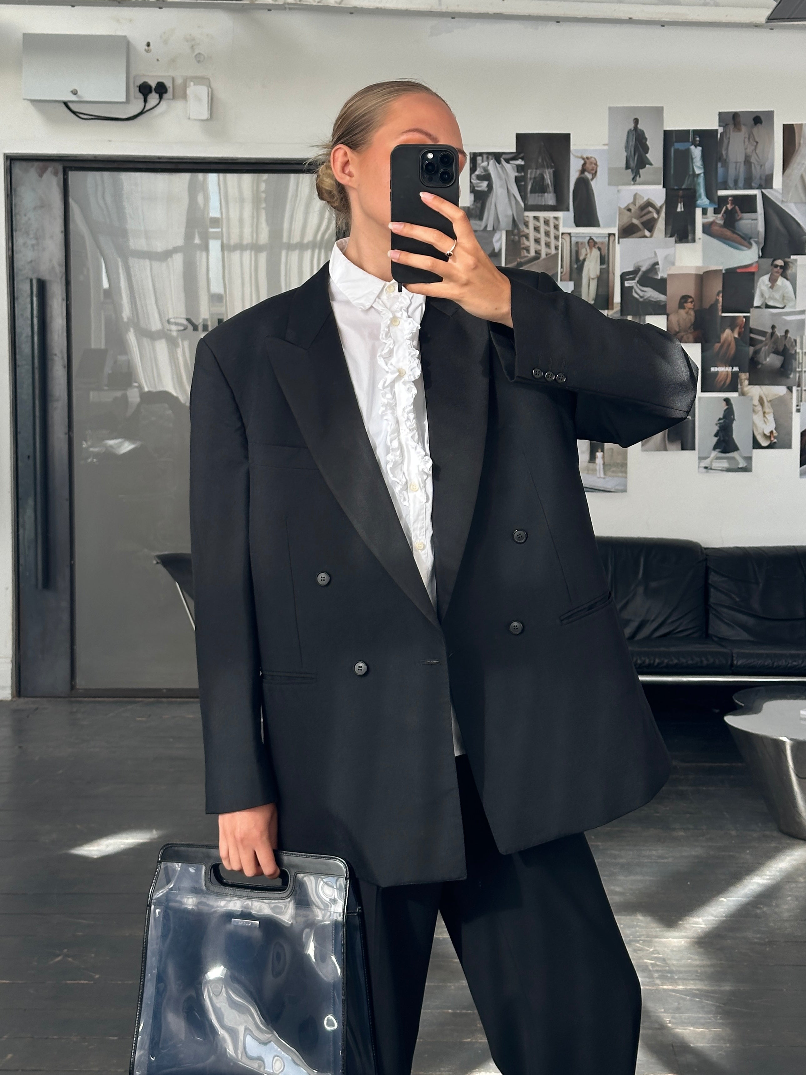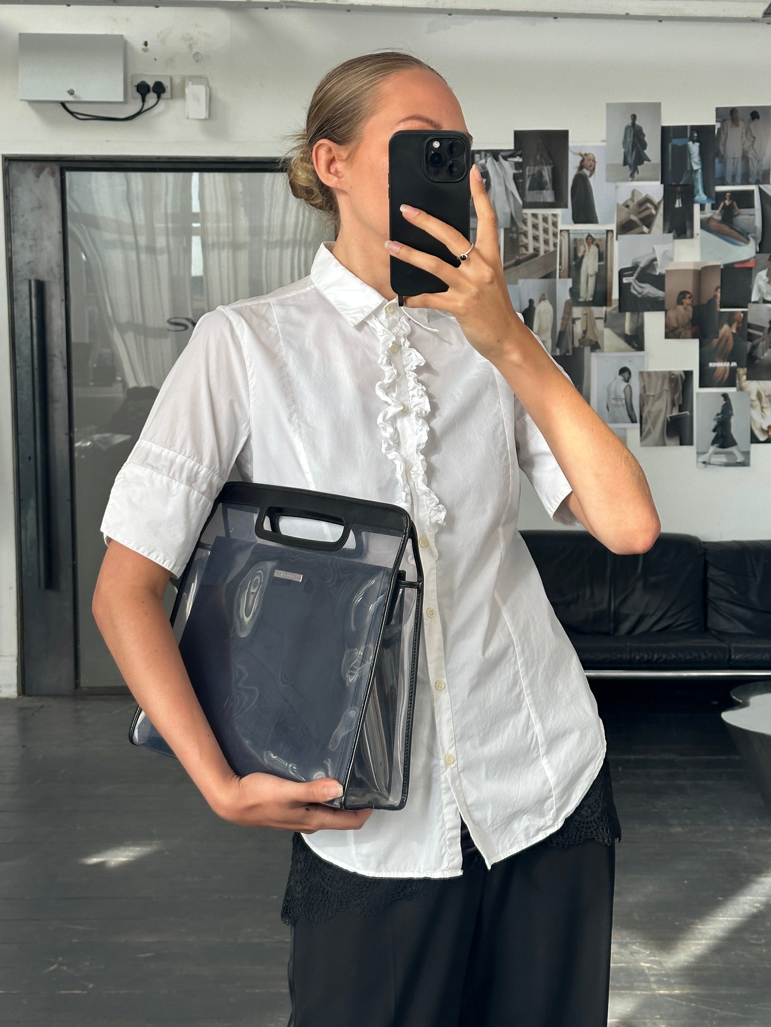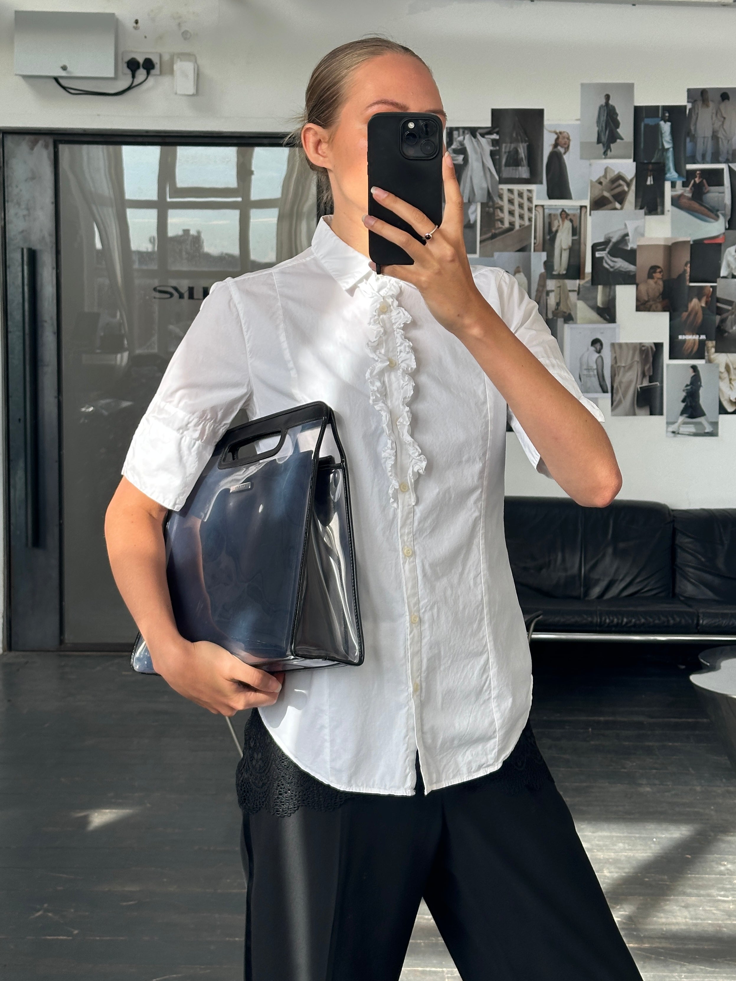 A crisp white Falke cotton shirt, cut with a slim pointed collar and short sleeves, elevated by a delicate ruffle trim for a refined yet playful finish.